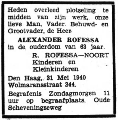 | Overlijden van een zus | Rachel Roffesa (Rofessa) 23 augustus 1942 (op de datum van overlijden) |